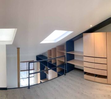 Incorporamos nichos iluminados artificialmente para aumentar la altura libre del primer piso en 40 cm. Los tubos bajantes de aguas pluviales se pintaron dentro de una paleta de colores neutros para que contrasten y se conviertan en elementos decorativos en la zona social.